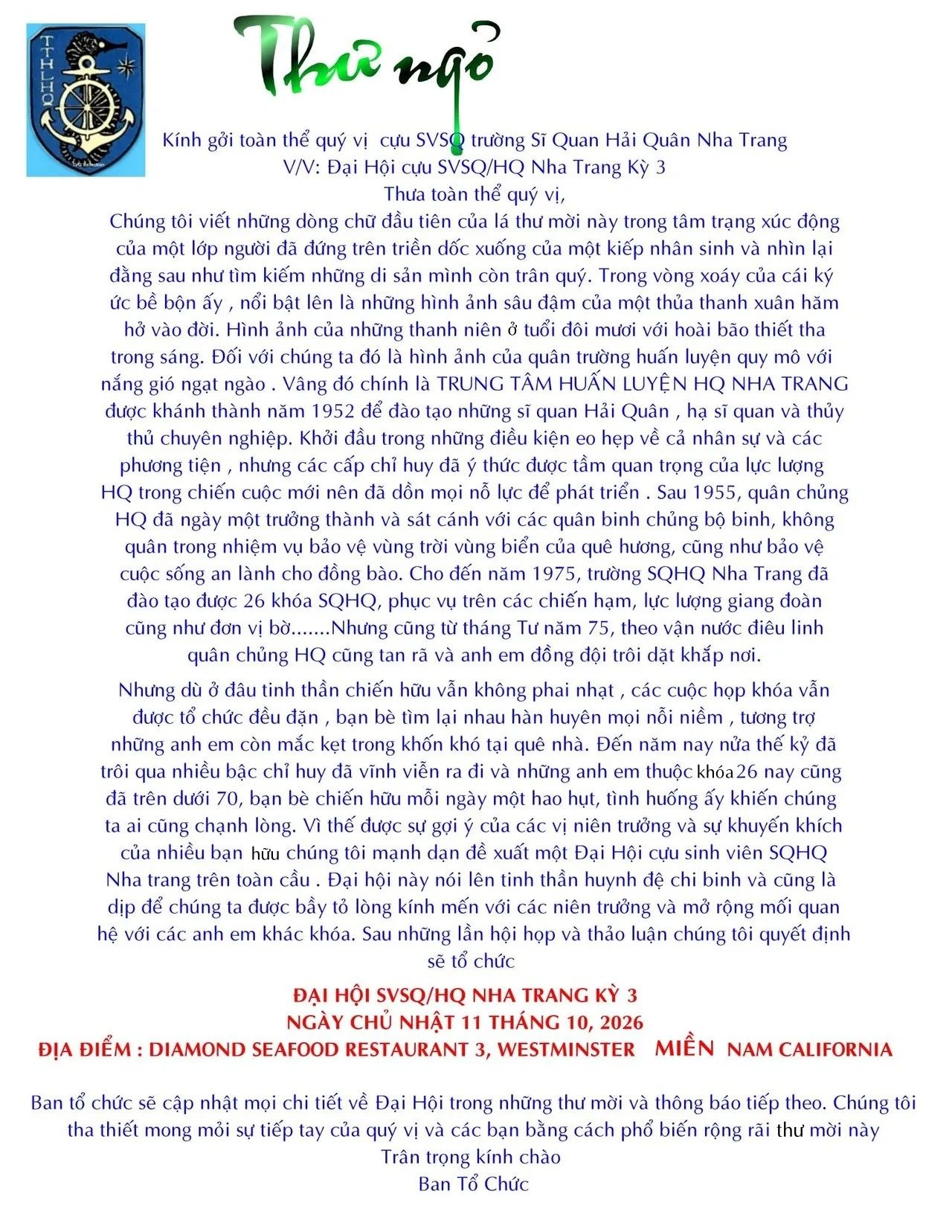 Về tham dự Đại Hội SVSQ/HQ/Nha-Trang III October 11, 2026. Để gặp lại bạn bè thân thương cùng quân trường mẹ